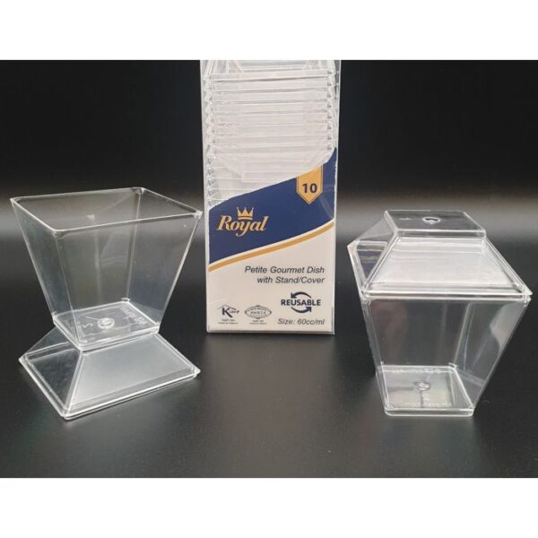The Mini Petite Gourmet Dish with Stand/Cover 60ml PK10 is a convenient and elegant option for serving small portions. This pack includes 10 mini gourmet dishes, each with a capacity of 60ml (approximately 2 ounces). The petite size makes them perfect for serving individual appetizers, desserts, or creative culinary presentations. The dishes come with stands and covers, providing a stylish way to present and protect the food. Their versatility and eye-catching design make them suitable for various occasions, from formal events to intimate gatherings. In conclusion, the Mini Petite Gourmet Dish with Stand/Cover 60ml PK10 offers a sophisticated and practical solution for showcasing delightful miniature culinary creations.
